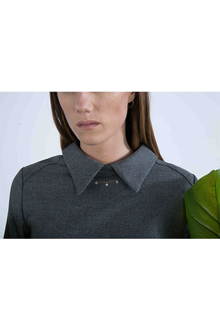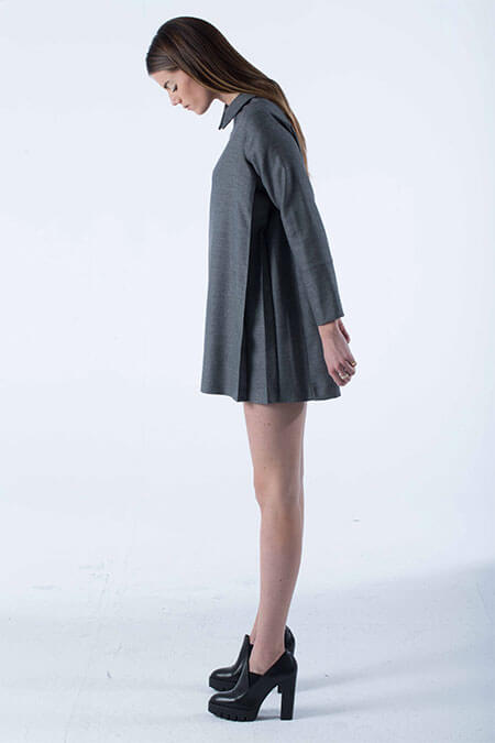 Vestido corto camisero en lana virgen gris metalizado con cuello de camisa. El vestido está inspirado en los uniformes contrasta su punto naïf con la rectitud de los detalles. La manga ajustada tiene un puño en la misma tela que permite doblarse si deseado. En uno de los laterales el vestido tiene tres tablas que añaden movimiento a la parte inferior del vestido de corte trapecio. Los hombros tienen una pieza que simulan hombreras reforzando su estabilidad. El vestido tiene una cremallera oculta