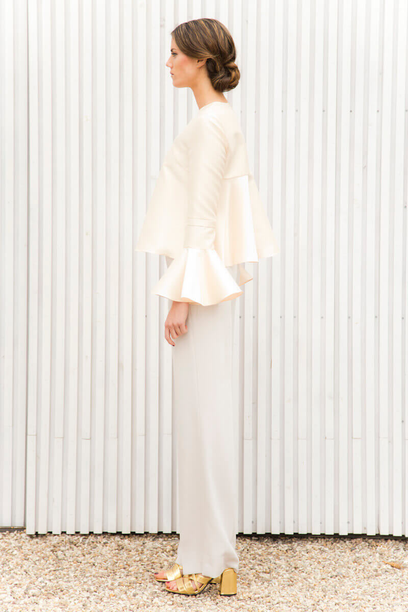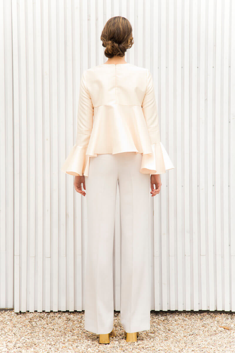 Top con escote redondo y volumen. Costura de pecho horizontal delante con bajada detrás y godes en la espalda. Forma de cuerpo trapecio con gran volumen. Mangas con volante en los puños. Cremallera invisible en la espalda.