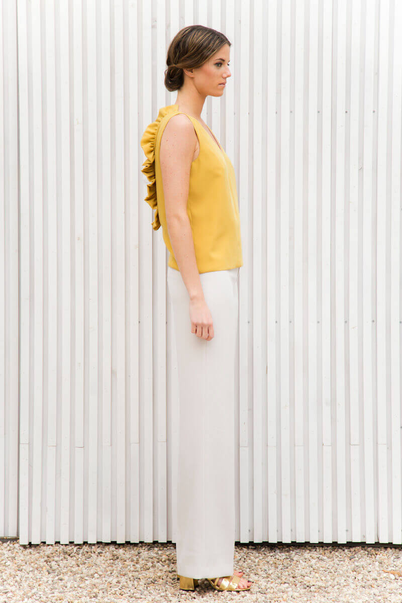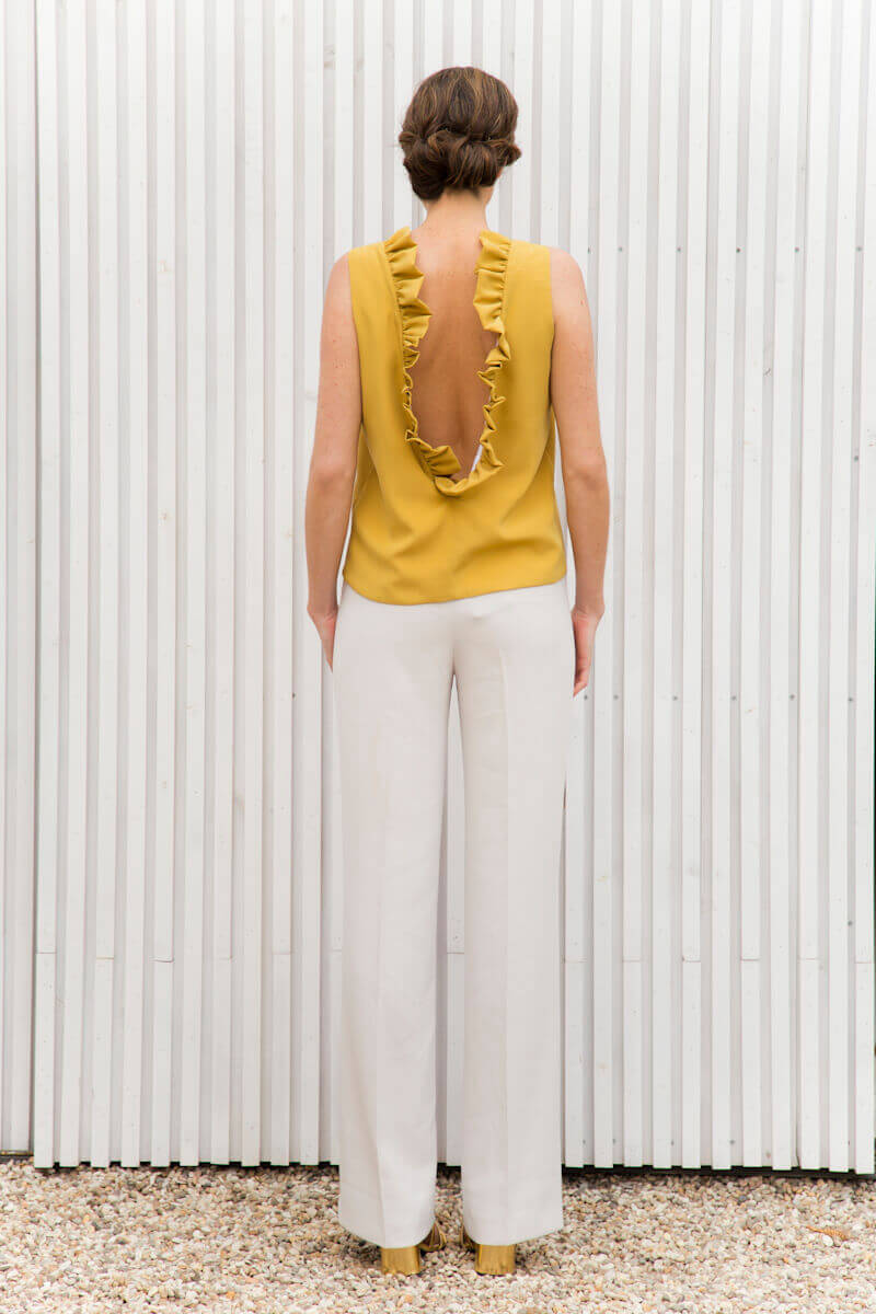 Top con escote en pico y tirante ancho. Gran apertura en pico en la espalda con volante plano a lo largo. El top tiene trabillas en los tirantes y un pequeño automático invisible para poder llevar el top con sujetador y cerrar la apertura a la altura del mismo o bien completamente abierto. El top está forrado en un agradable voile algodón.