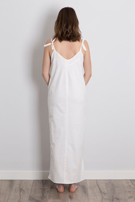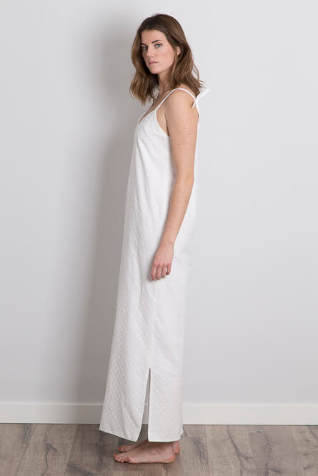 Vestido de algodón bordado con aperturas laterales. Silueta columna y largo tobillo. El vestido va forrado en voile de algodón orgánico. ¡Los tirantes son ajustables para que puedas elegir el escote que quieras!
