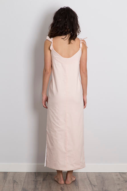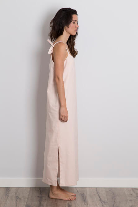 Vestido de algodón con aperturas laterales. Silueta columna y largo midi. El vestido va forrado en voile de algodón orgánico. ¡Los tirantes son ajustables para que puedas elegir el escote que quieras!