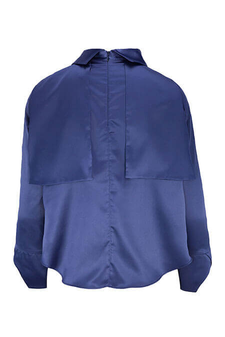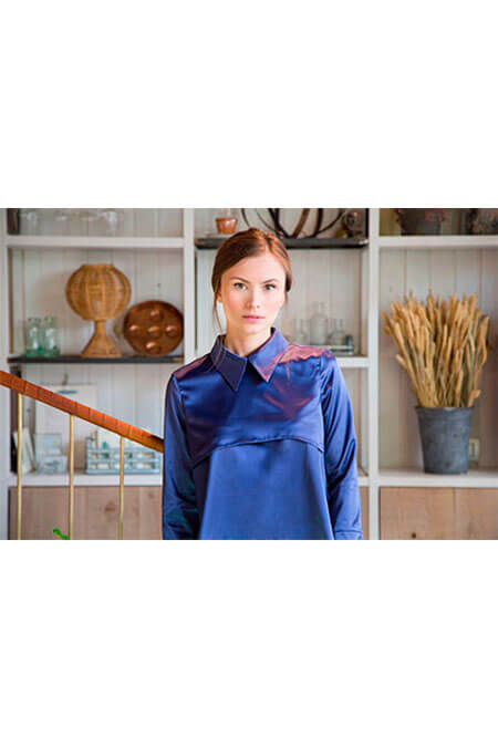Camisa con solapa y puño cruzado. Costura de pecho en media luna. Solapa a tono delante y espalda. Cuello de camisa. Largo cintura con bajo pañuelo. Puños cruzados en manga 3/4 Forma de cuerpo trapecio con ligero volumen. Cremallera invisible en la espalda.