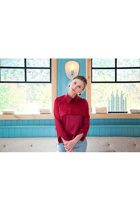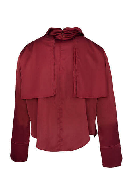 Camisa con solapa y puño cruzado. Costura de pecho en media luna. Solapa a tono delante y espalda. Cuello de camisa. Largo cintura con bajo pañuelo. Puños cruzados en manga 3/4 Forma de cuerpo trapecio con ligero volumen. Cremallera invisible en la espalda.