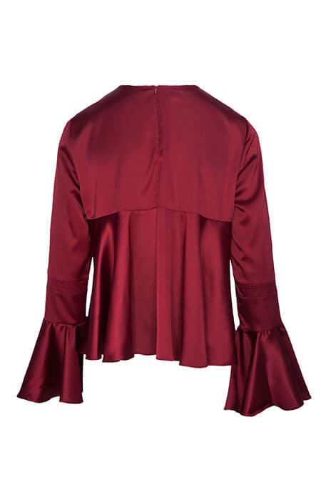 Top con escote redondo y volumen. Costura de pecho horizontal delante con bajada detrás y godes en la espalda. Forma de cuerpo trapecio con gran volumen. Mangas con volante en los puños. Cremallera invisible en la espalda.